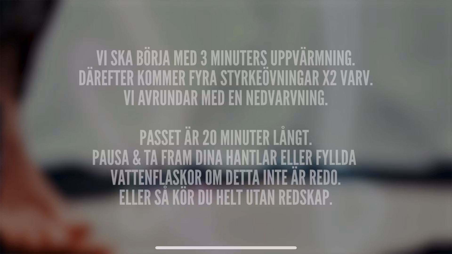 Varje pass är 20 minuter långt inklusive uppvärmning och nedvarvning/stretch. Inga redskap behövs, men om man vill kan det vara bra att ha (men inte ett krav) en träningsmatta.