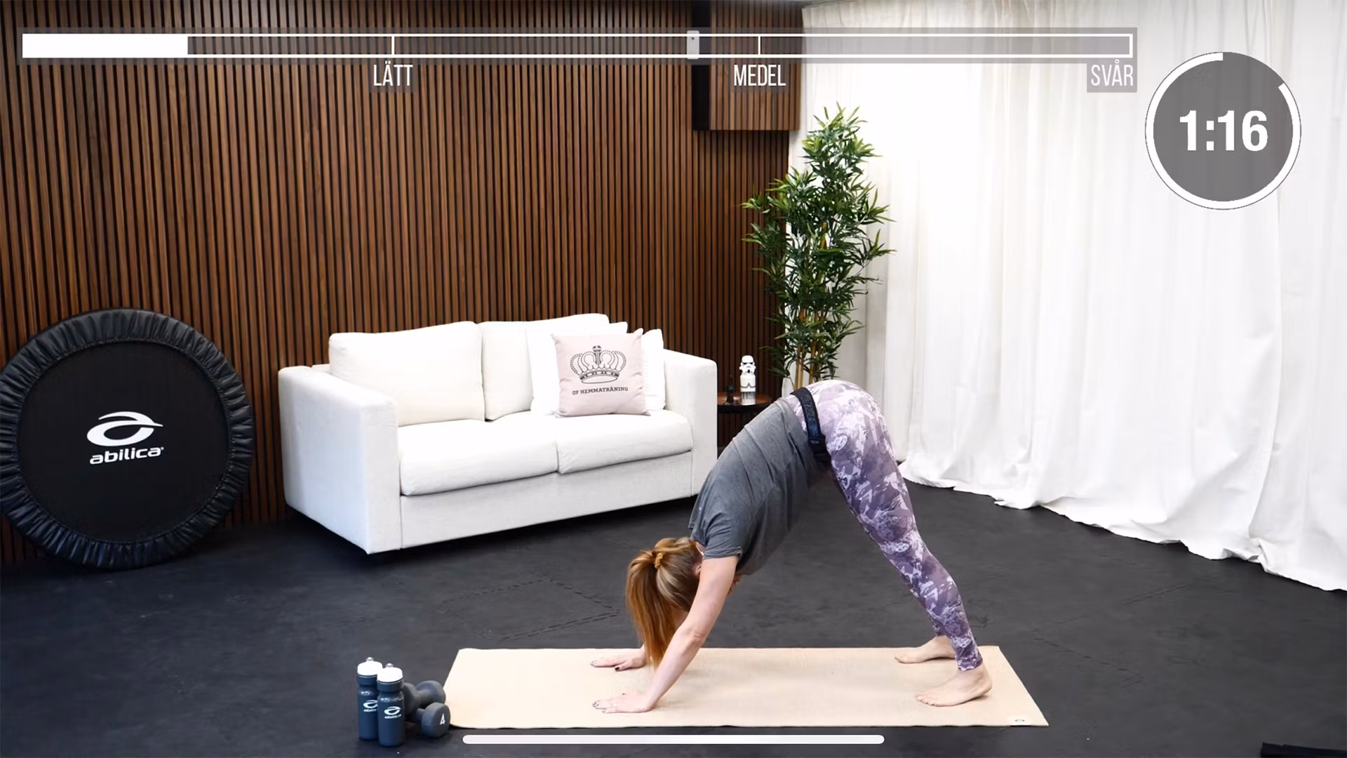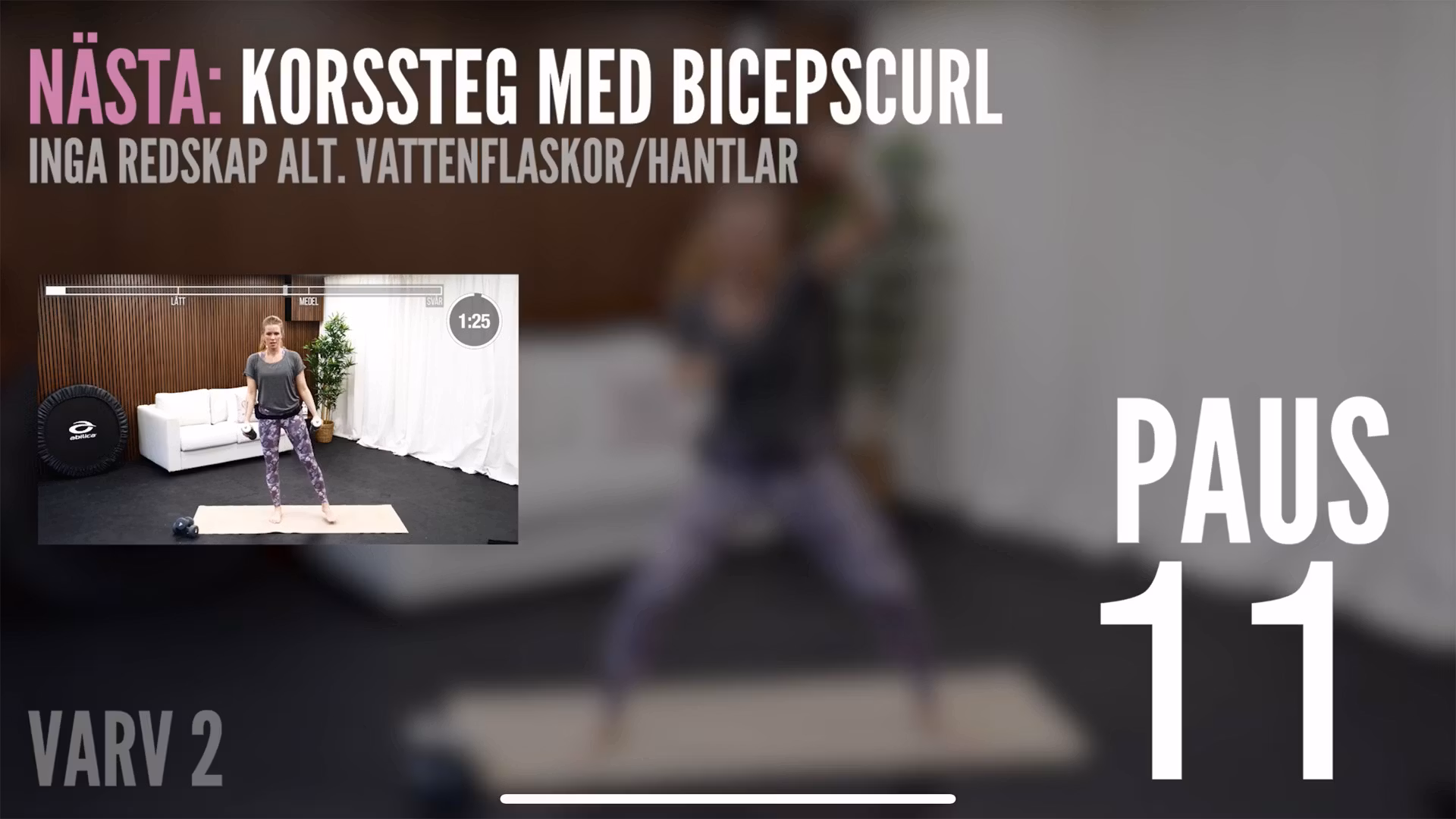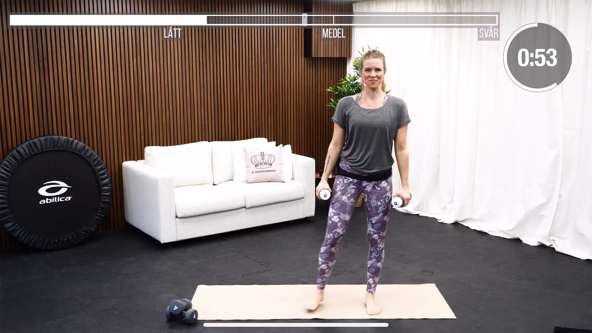 Varje vecka i åtta veckor får du tre träningspass med mig som instruktör direkt i appen. Först kommer fyra veckor som sedan repeteras en gång till. Passen är alltså instruktörsledda och varierat sammansatta av över 30 olika övningar. Passen består enbart av styrkeövningar och dessa övningar passar alla då jag berättar om olika nivåer där du väljer den nivå som passar dig. En annan sak som gör det enkelt för dig att anpassa till din nivå är att:
