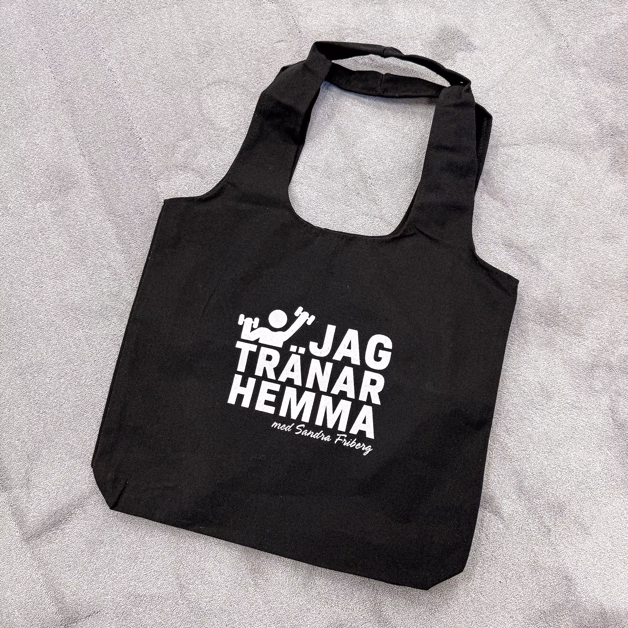 Med denna snygga och stilrena tygpåse visar du att du är en stolt hemmatränare med mig. Den har kraftigare och lite kortare handtag som är sköna att hålla i... Det gör även att påsen inte släpar i marken om du väljer att att bära den i handtagen. Trycket blev tunnare än förväntat och det är små svarta prickar i det vita trycket pga att det svarta tyget "blöder" igenom, därav sänkt pris. Tyget är kraftigt och kvalitativt.