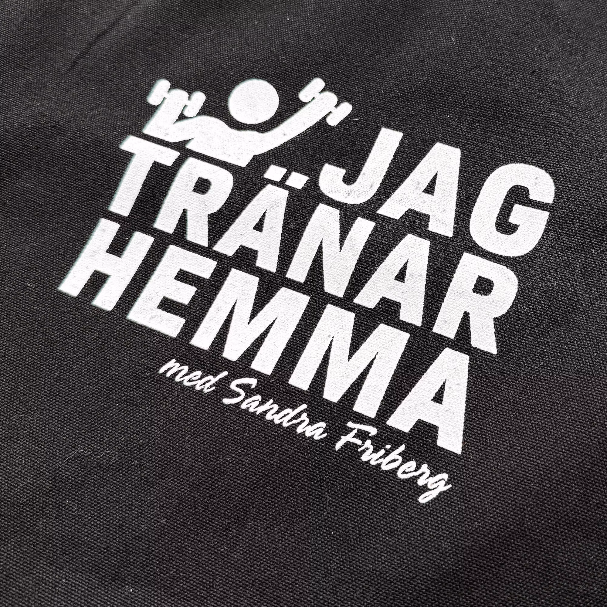 Med denna snygga och stilrena tygpåse visar du att du är en stolt hemmatränare med mig. Den har kraftigare och lite kortare handtag som är sköna att hålla i... Det gör även att påsen inte släpar i marken om du väljer att att bära den i handtagen. Trycket blev tunnare än förväntat och det är små svarta prickar i det vita trycket pga att det svarta tyget "blöder" igenom, därav sänkt pris (50%). Tyget är kraftigt och kvalitativt.
